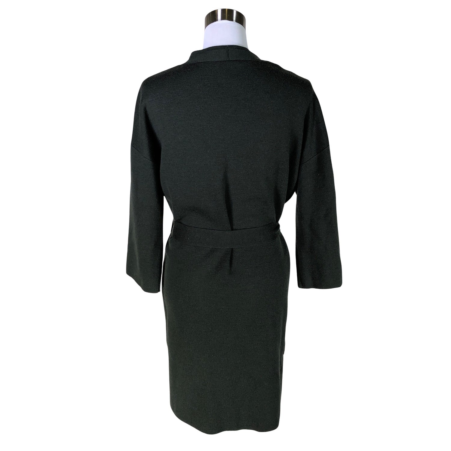 Avonainen malli. Ohutta neulosta. Villasekoitetta. Tuotteeseen kuuluu vyö. Vaatteessa on taskut.