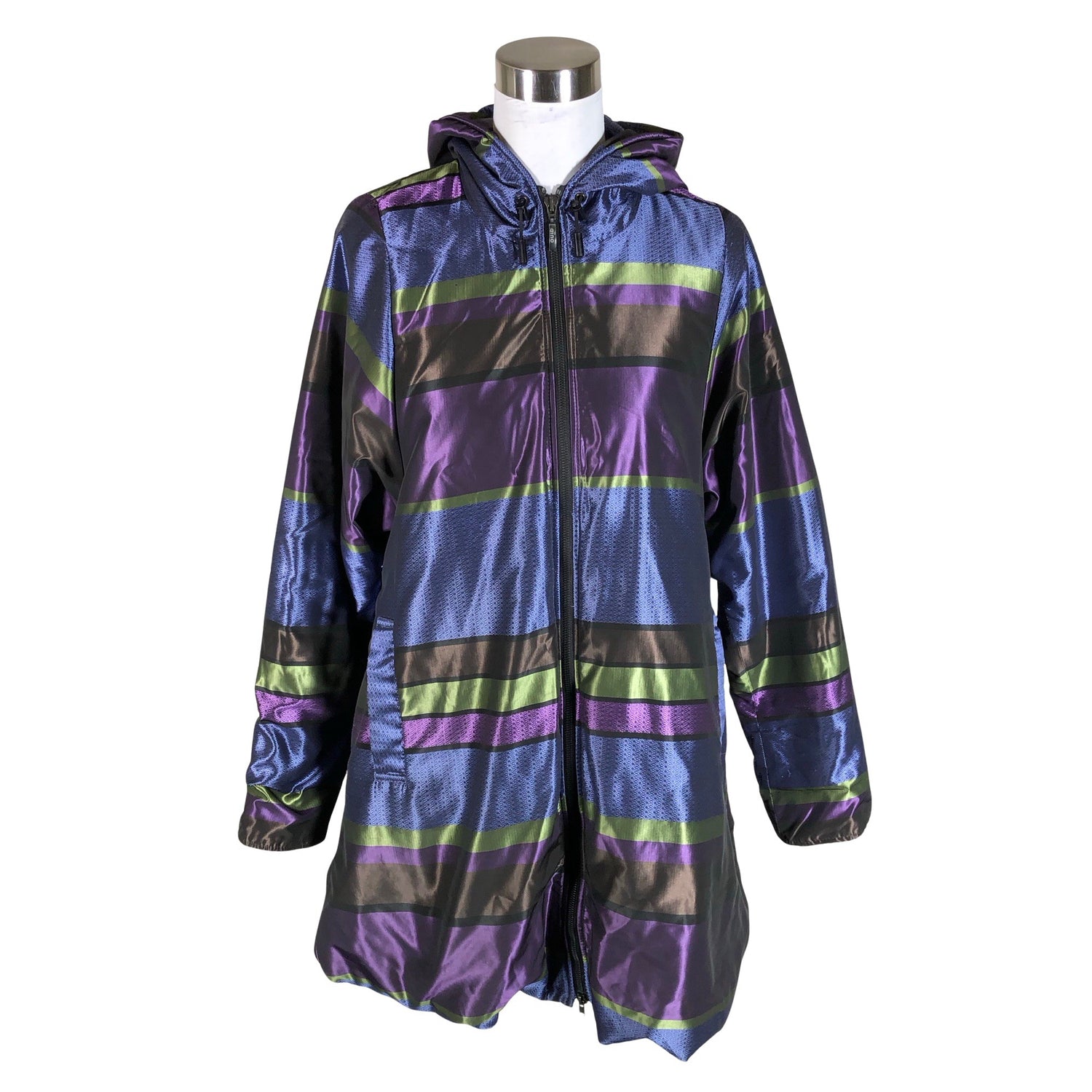 Tuotteessa on kaksisuuntainen vetoketju. Tuotteen pinta on kiiltävä. Vaatteessa on taskut. Tuotteen pinnassa on hieman pesu-/käyttökulumaa. Yleisilme on siisti.