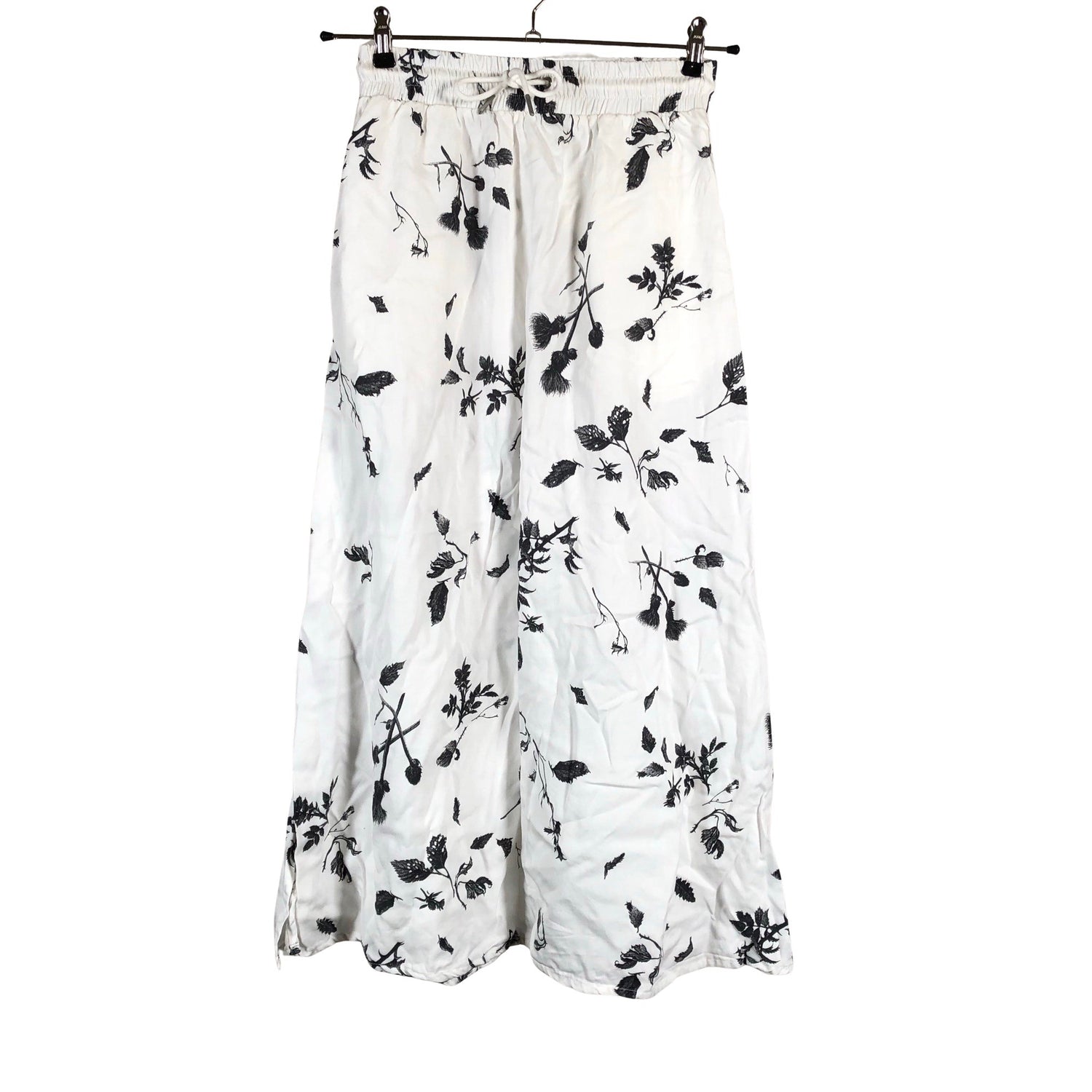 Kiristysnauha vyötäröllä. Materiaali ei jousta. Sivusaumoissa on halkiot.