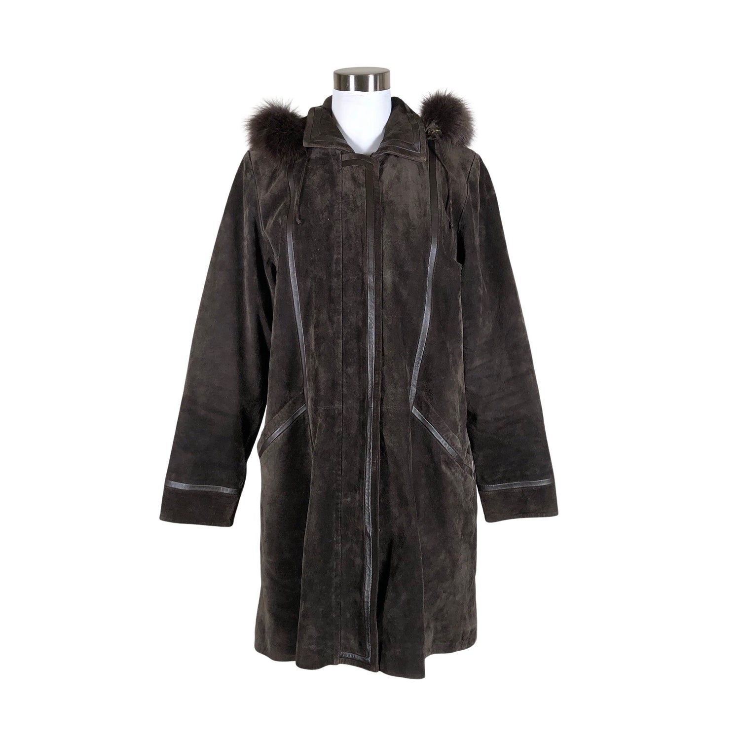 Mokkamainen pinta. Materiaalitieto puuttuu. Todennäköisesti nahkaa. Irrotettava huppu. Irrotettava karvakaulus. Tuotteessa on ohut vuori. Tuotteen pinnassa on hieman pesu-/käyttökulumaa. Tuotteen pinnassa on haalea tahra. Tuote on muilta osin hyvässä kunnossa.