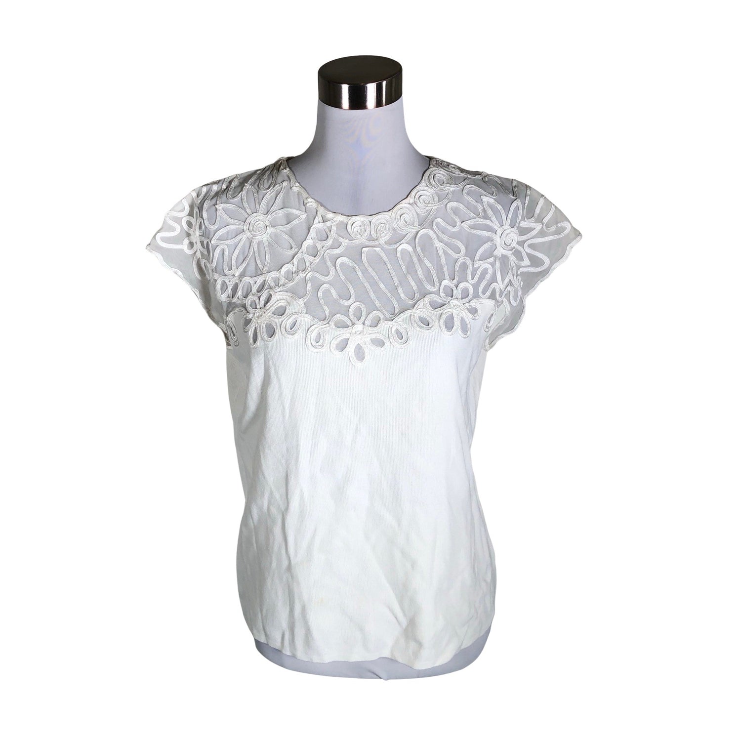 Tuotteen ylä- ja alaosa ovat eri materiaalia. Trikoota. Tuote on osin läpikuultavaa materiaalia. Kauluksessa on aavistus tummentumaa. Tuote on muilta osin hyvässä kunnossa.