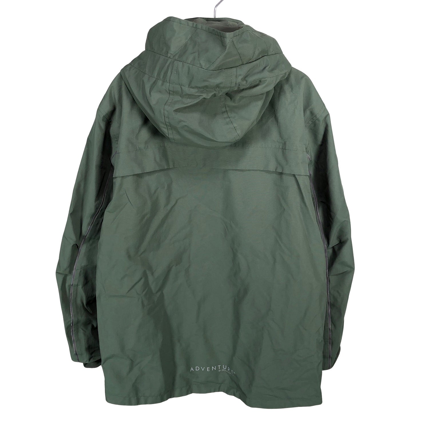 Breathable -merkintä. Windproof -merkintä. Waterproof -merkintä. Teipatut saumat. Hyvät tekniset ominaisuudet. Tuotteessa on heijastavia yksityiskohtia. Irrotettava huppu. Tuotteen pinnassa on hieman pesu-/käyttökulumaa. Yleisilme on siisti.