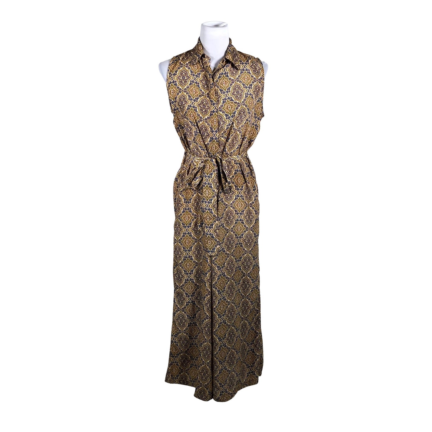 Laskeutuvaa materiaalia. Vaatteessa on taskut. Tuotteeseen kuuluu vyö.