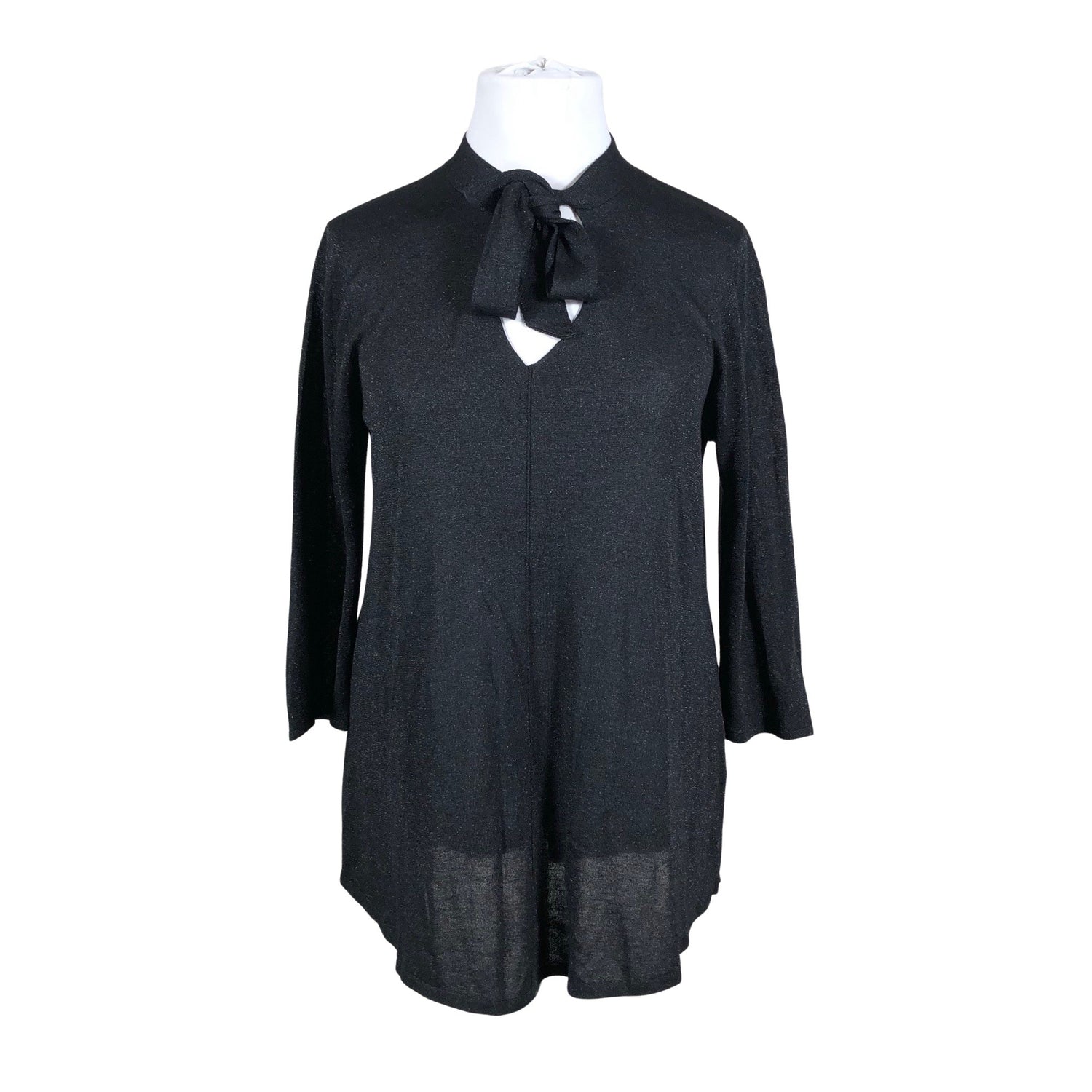 Ohutta neulosta. Tuotteen pinnassa on kimalletta. Solmittava malli. Vajaamittaiset hihat.