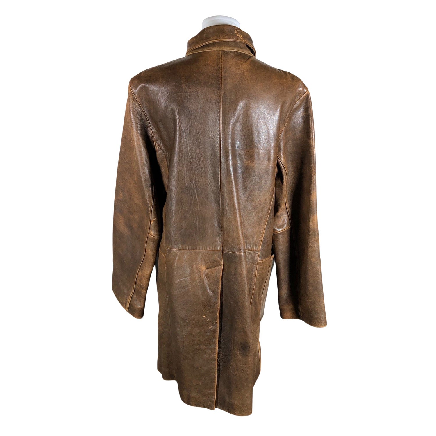 Nahkaa. Kulutettu kuosi. Vaatteessa on taskut. Takasaumassa on halkio. Tuotteen pinnassa on hieman pesu-/käyttökulumaa. Yleisilme on siisti.