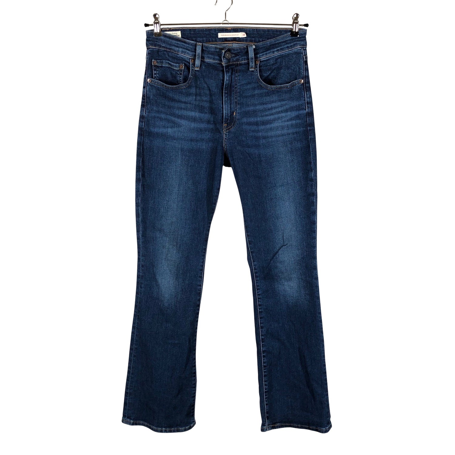 Malli: 725 High rise bootcut. Kulutettu kuosi.Materiaali joustaa hieman. Tuotteen pinnassa on aavistus pesu-/käyttökulumaa. Yleisilme on siisti.