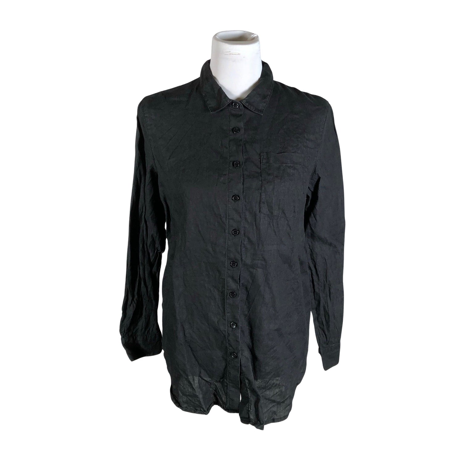 Materiaali ei jousta. Edessä napit. Kauluksessa on aavistus kulumaa. Tuote on muilta osin hyvässä kunnossa.