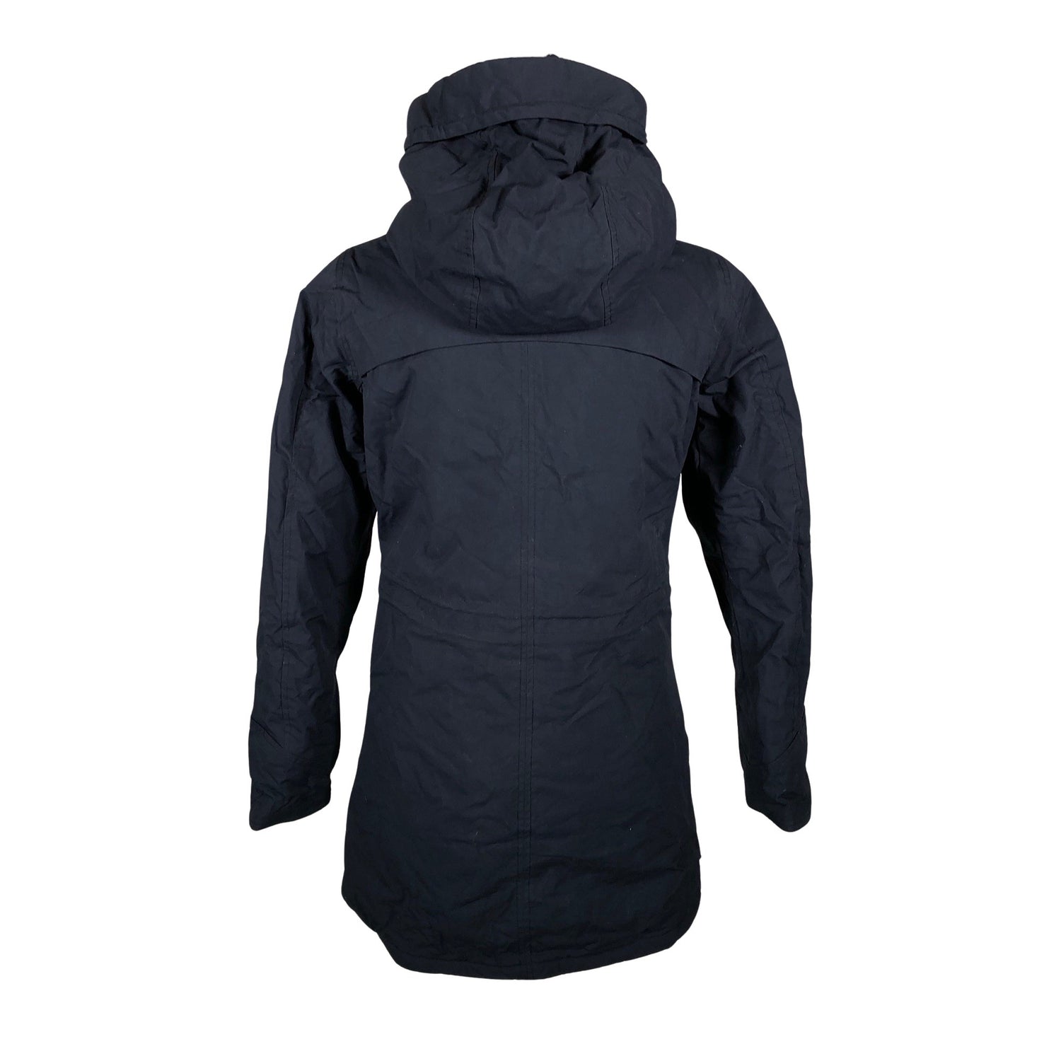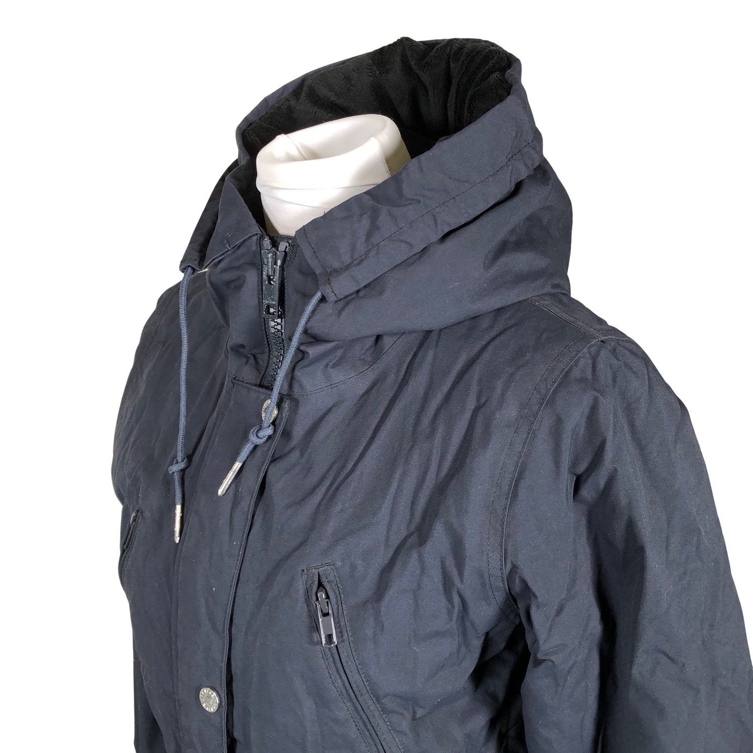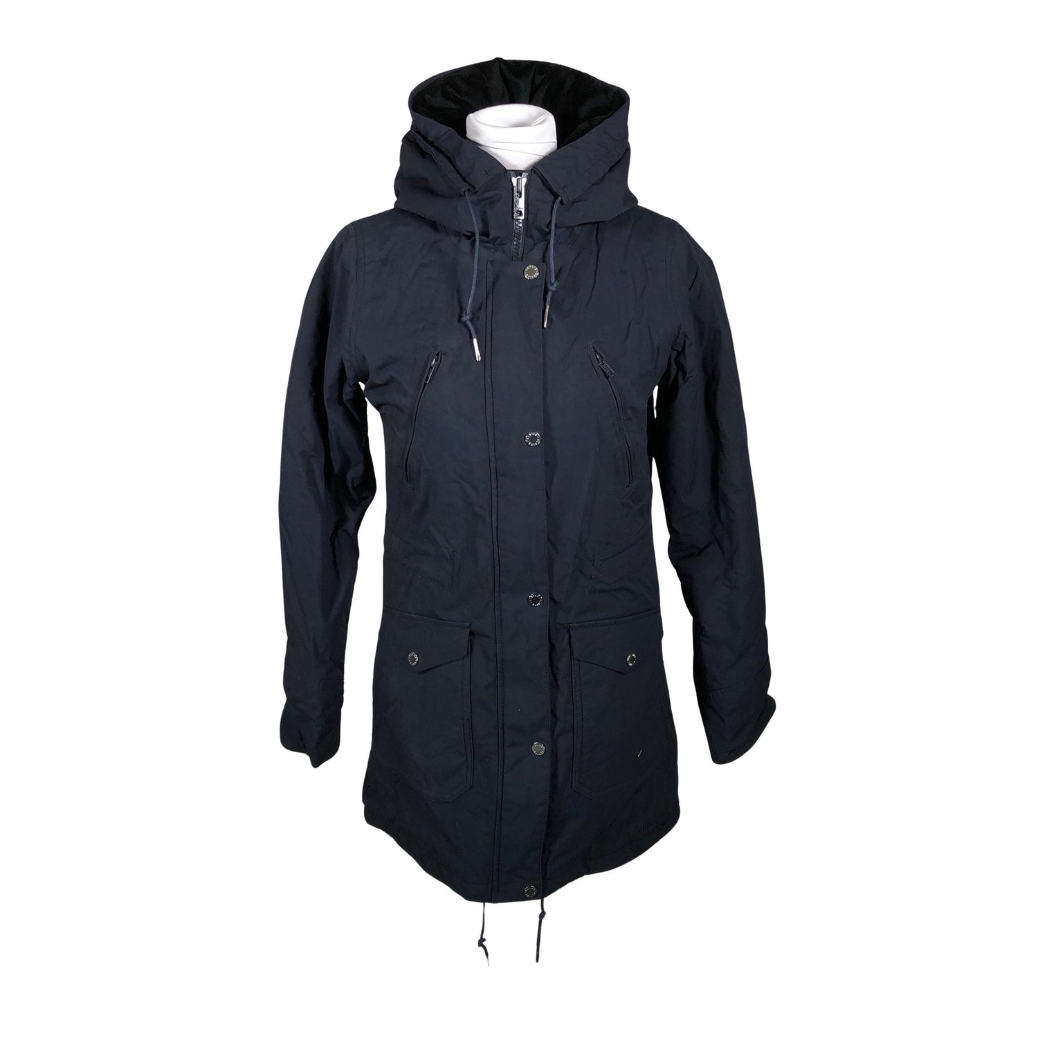 Parkatakki. Kiristysnauha vyötäröllä. Paksua materiaalia. Vaatteessa on taskut. Tuotteessa on kaksisuuntainen vetoketju. Tuotteen pinnassa on aavistus käyttölikaa. Lähtee todennäköisesti pesussa. Tuotteen pinnassa on hieman pesu-/käyttökulumaa. Yleisilme on siisti.