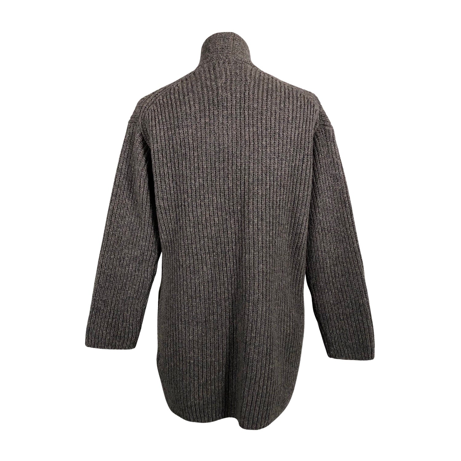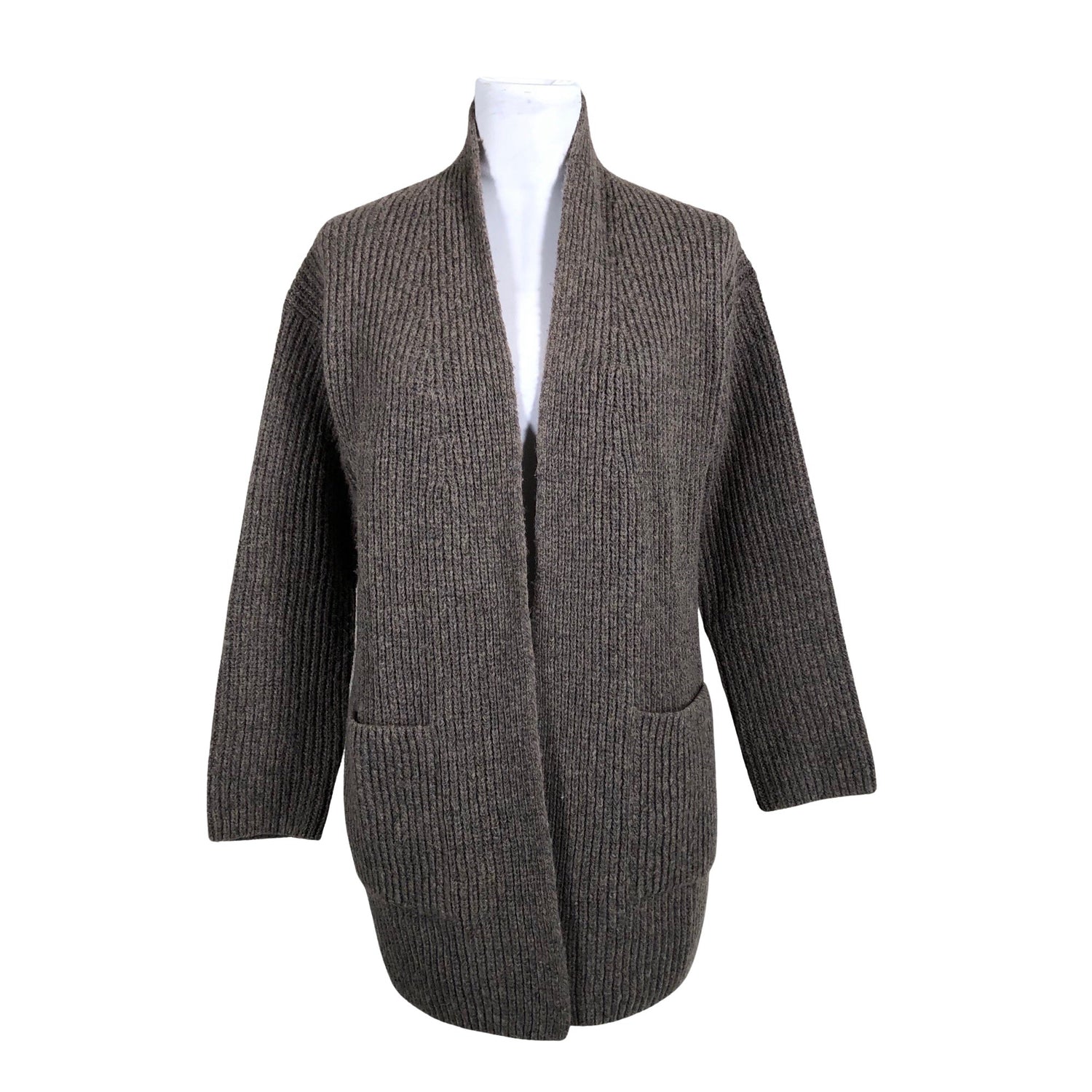 Paksua neulosta. Ei kiinnitystä. Vaatteessa on taskut. Tuotteen pinnassa on aavistus pesu-/käyttökulumaa. Yleisilme on siisti.