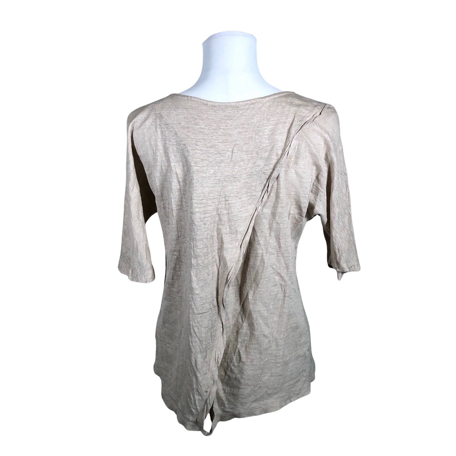 Sample/mallikappale. Materiaalitieto puuttuu, todennäköisesti pellavaa/pellavasekoitetta. Tuotteen pinnassa on hieman pesu-/käyttökulumaa. Yleisilme on siisti.
