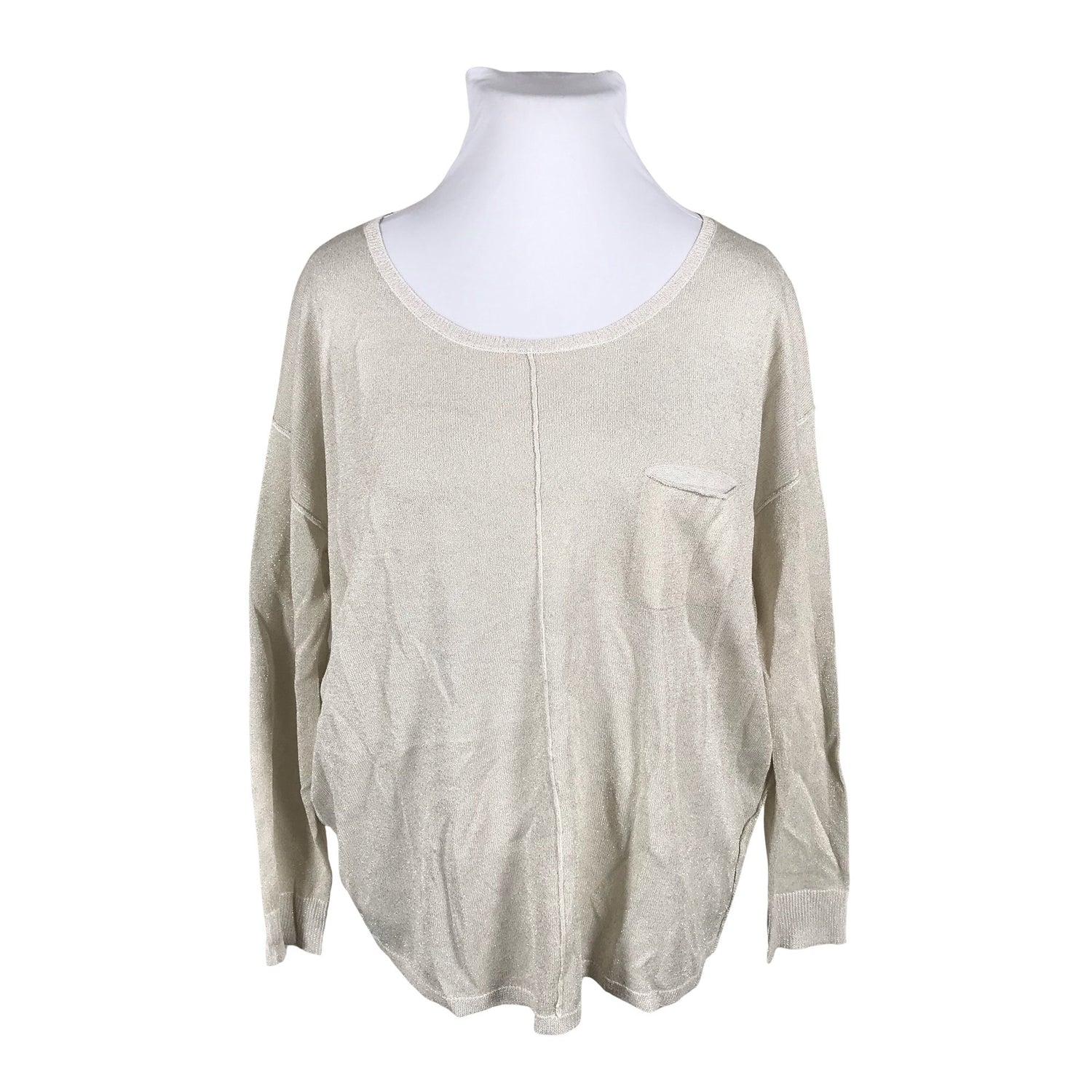 Tuotteen pinnassa on kimalletta. Väri: kulta. Ohutta neulosta. Kauluksessa on hieman meikkitahraa. Tuotteen pinnassa on langannousu/langankiristymä. Tuote on muilta osin hyvässä kunnossa.