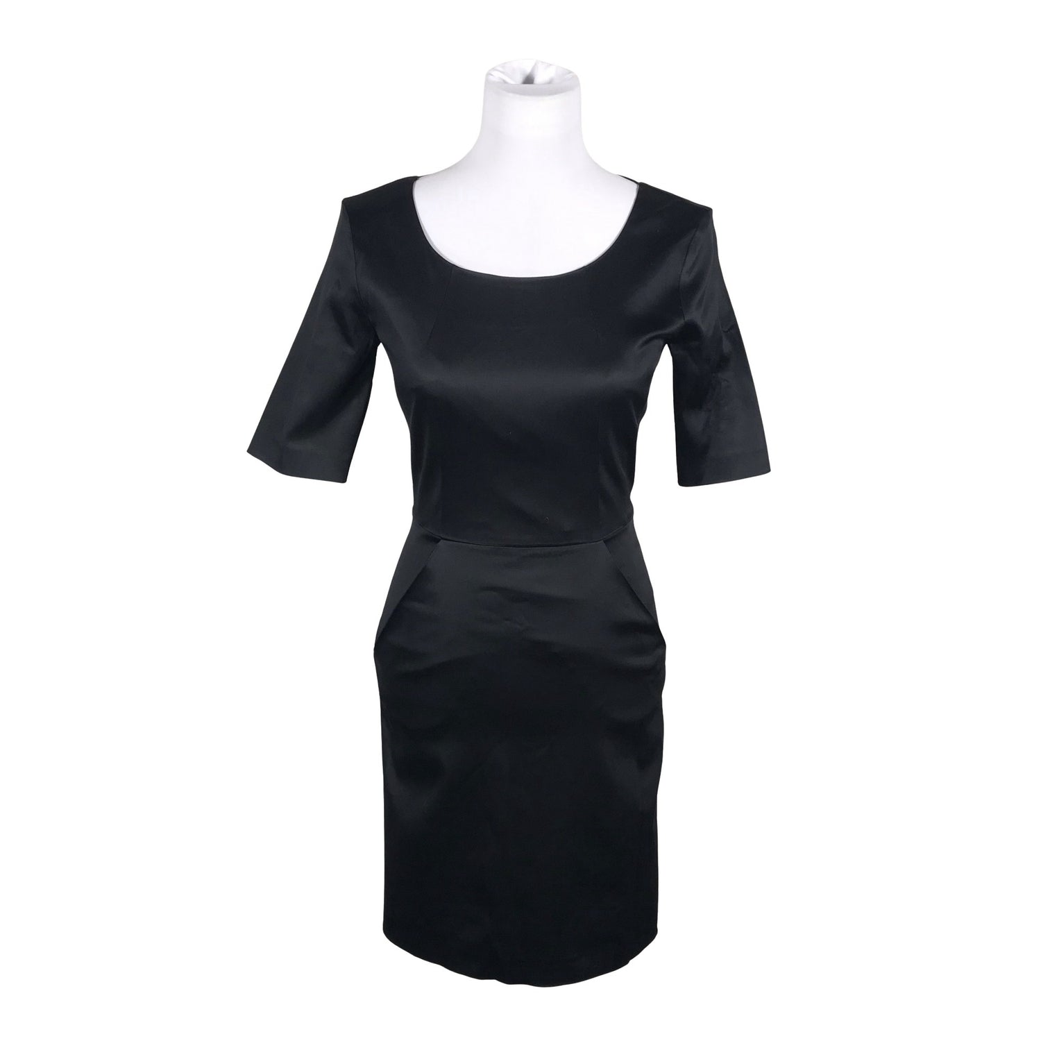 Tyköistuva malli. Satiinia. Materiaali joustaa. Vaatteessa on taskut. Vetoketju takana. Tuotteessa on ohut vuori. Käsinpesu. Deodorantin tahraa hieman kainaloissa. Tuote on muilta osin uudenveroisessa kunnossa.