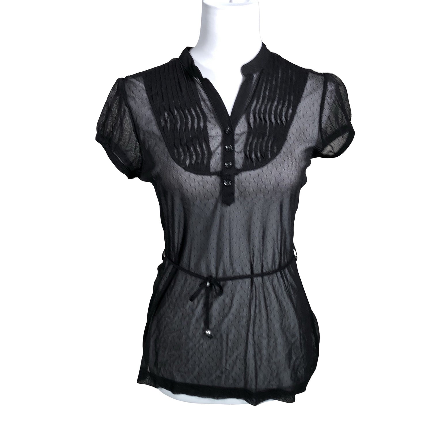 Mesh-kangasta. Läpikuultava kangas. Tuotteeseen kuuluu vyö.